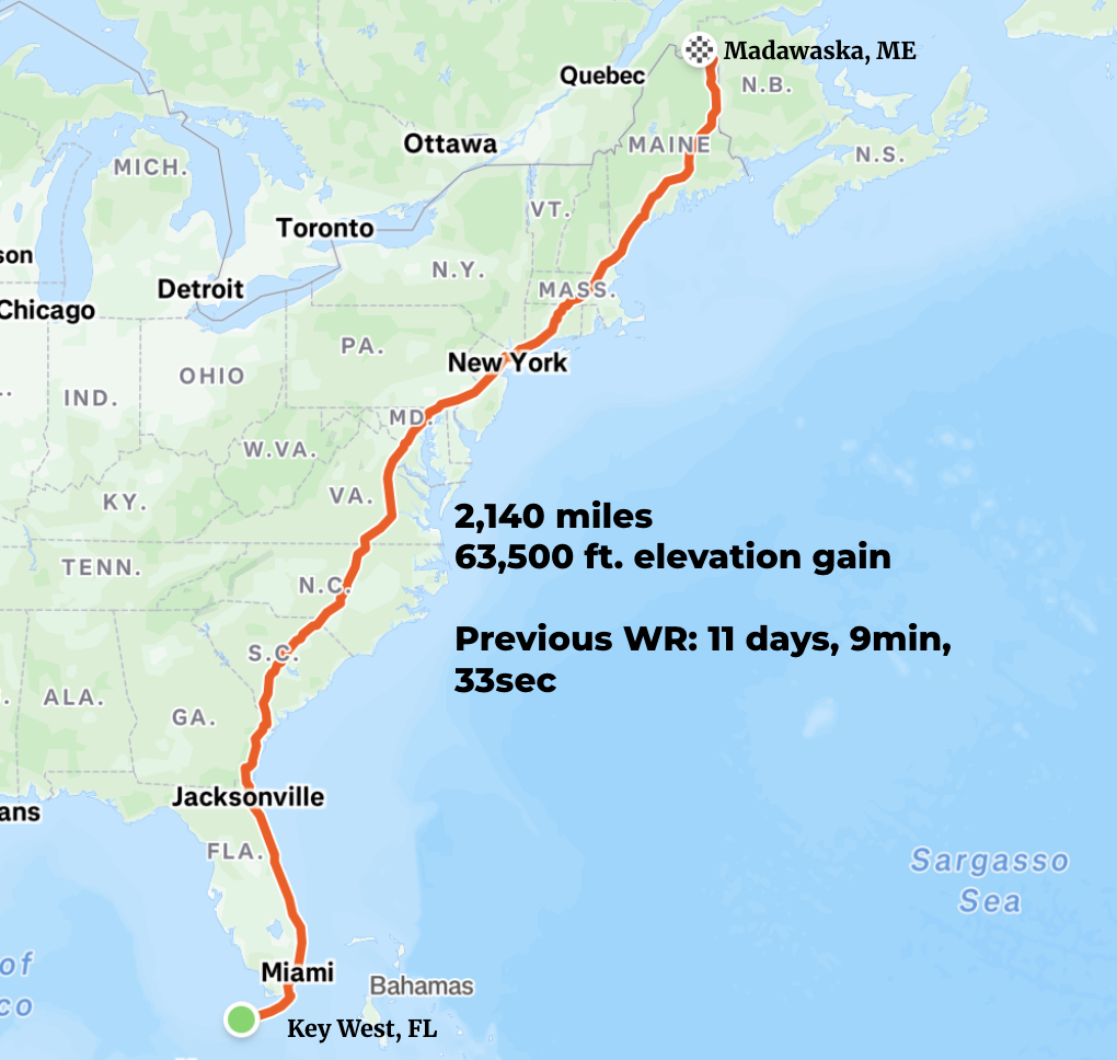 On September 8, 2025 I reached the Canadian Border in Madawaska, Maine, completing my crossing of the United States in 8 days, 5 hours, 56 minutes, and 17 seconds, setting a new world record by nearly 3 days.